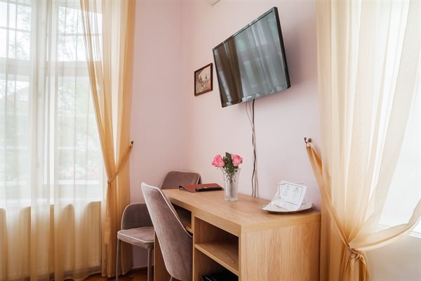 fén, křeslo, minibar, psací stůl, trezor, prostorově menší pokoj s balkonem